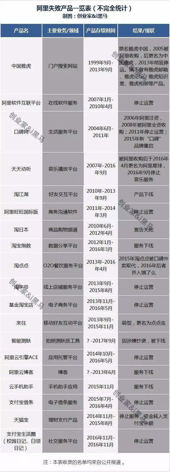 编者按:巨头也有“难养的儿子”,在扩张帝国版图的同时,也会不断折戟。百度如此,腾讯如此,阿里更是如此。“阵亡”的产品成为了巨头成长路上的垫脚石,也记录了巨头发展的轨迹。此前我们在《百度“阵亡全家桶”》《腾讯“阵亡全家桶”》两篇文章中梳理过百度、腾讯两家的失败产品,今天我们将目光转移到阿里身上。