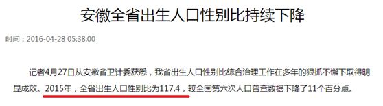 这是安徽省万万没想到的结果,不仅如此,在2014年的时候,安徽省的目标还是力争到2015年控制在119.78,结果没想到2015年性别比大幅下降到了117.4