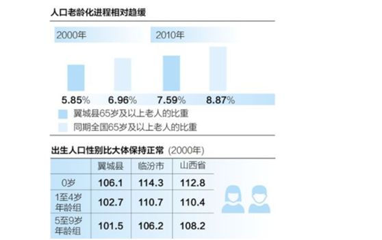 在全面一胎化的背景下,中国有四个地区实行了二孩试点,其中我国山西省临汾市翼城县,是我国唯一连续三十年试点二孩的县城,到2000年的时候,0-4岁组性别比为102.7,非常健康,而临汾市总体水平是110.7,也就是同在临汾的其他县性别比远比翼城失衡,而山西总体是110.4。值得一提的是,不仅性别比正常,而且翼城县的老龄化水平也远优于全国水平。