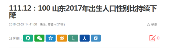 所以估计2017年的出生性别比比起2016年的112.88还有大幅下降,估计到了110-111左右。以我国第一生育大省山东省为例,山东省2017年出生人数占全国比例高达10%(中华复兴靠山东啊),2017年山东省出生性别比由2016年的112.6下降为111.12。