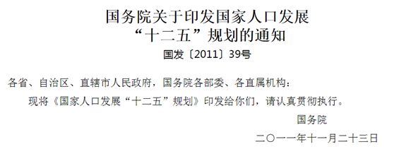 2011年11月,国务院发布了《国家人口发展十二五规划》,,提出2015年的出生人口性别比目标为115. 而在这个规划提出的时候,2010年中国出生人口性别比为117.94. 这是中国首次把控制人口出生性别比纳入国家规划。