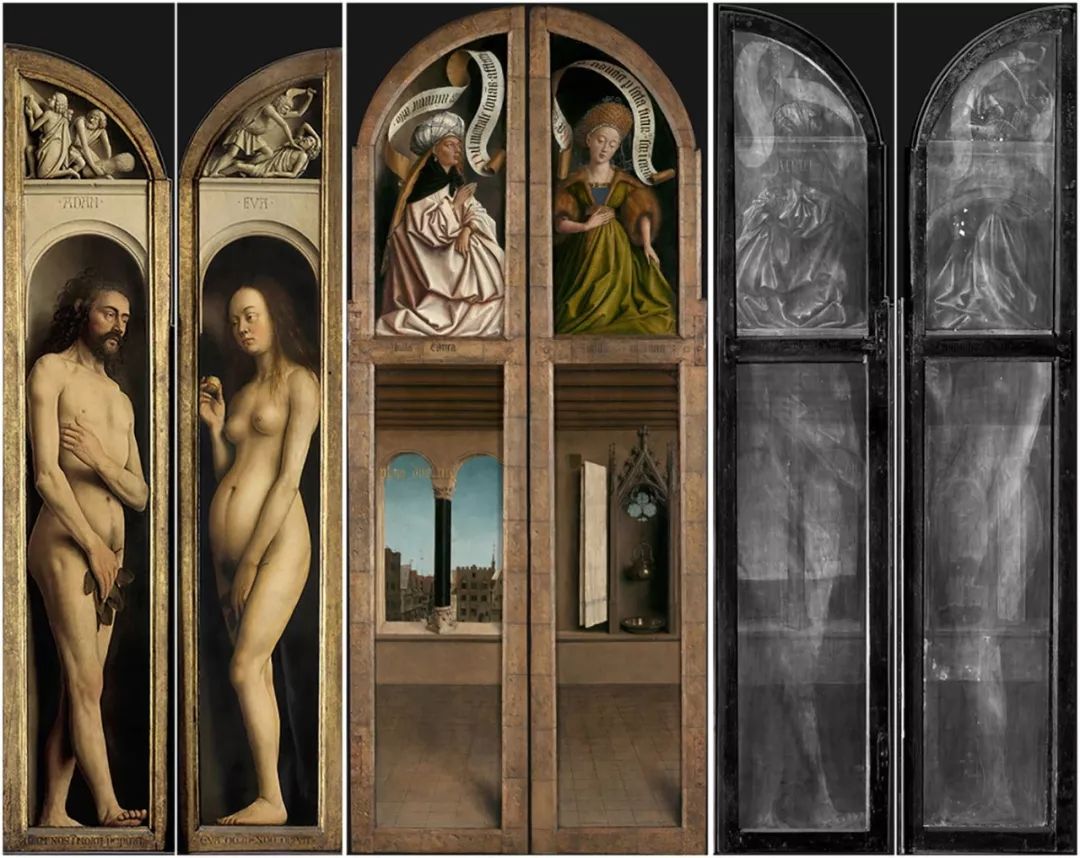 根特祭坛画中,有几块画板正反面都绘制有图案,X 射线扫描出复杂的三维吸收图案,最终却被记录成二维文件,所以呈现出来的是混在一起的复杂图像。