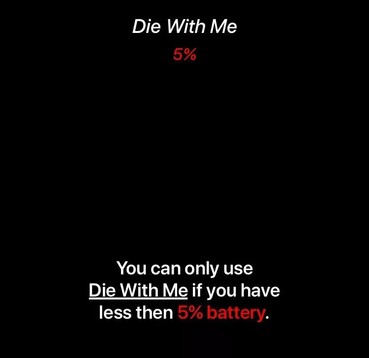 前不久下了一款社交软件,叫Die With Me,是个聊天室,只能在手机电量低于5%的时候进,和一群陌生人闲聊几句。