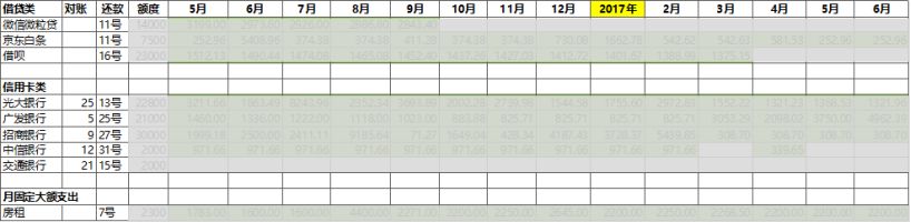 阿桦想了想,这两个账户很重要,目前我在欠款过多的情况下,还是先以还款为首要任务,定个小目标,在第9个月(2017年2月),开始往保值账户存入 xxx 元。在还清欠款后3个月(2017年9月),启动增值账户。