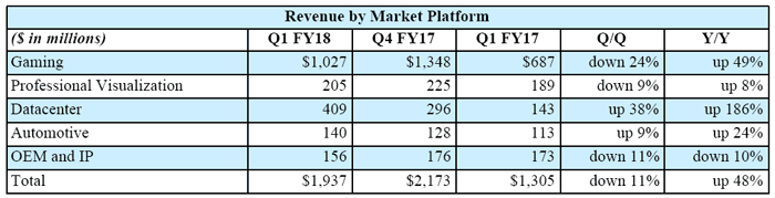 不过,虽然这些 GPU 在游戏和其他图像密集型应用中被广泛使用,但是从英伟达近年来的财报可以看出,数据中心的业绩虽然增幅很大,但从GPU在人工智能领域的整体情况来看,并不是非常理想。