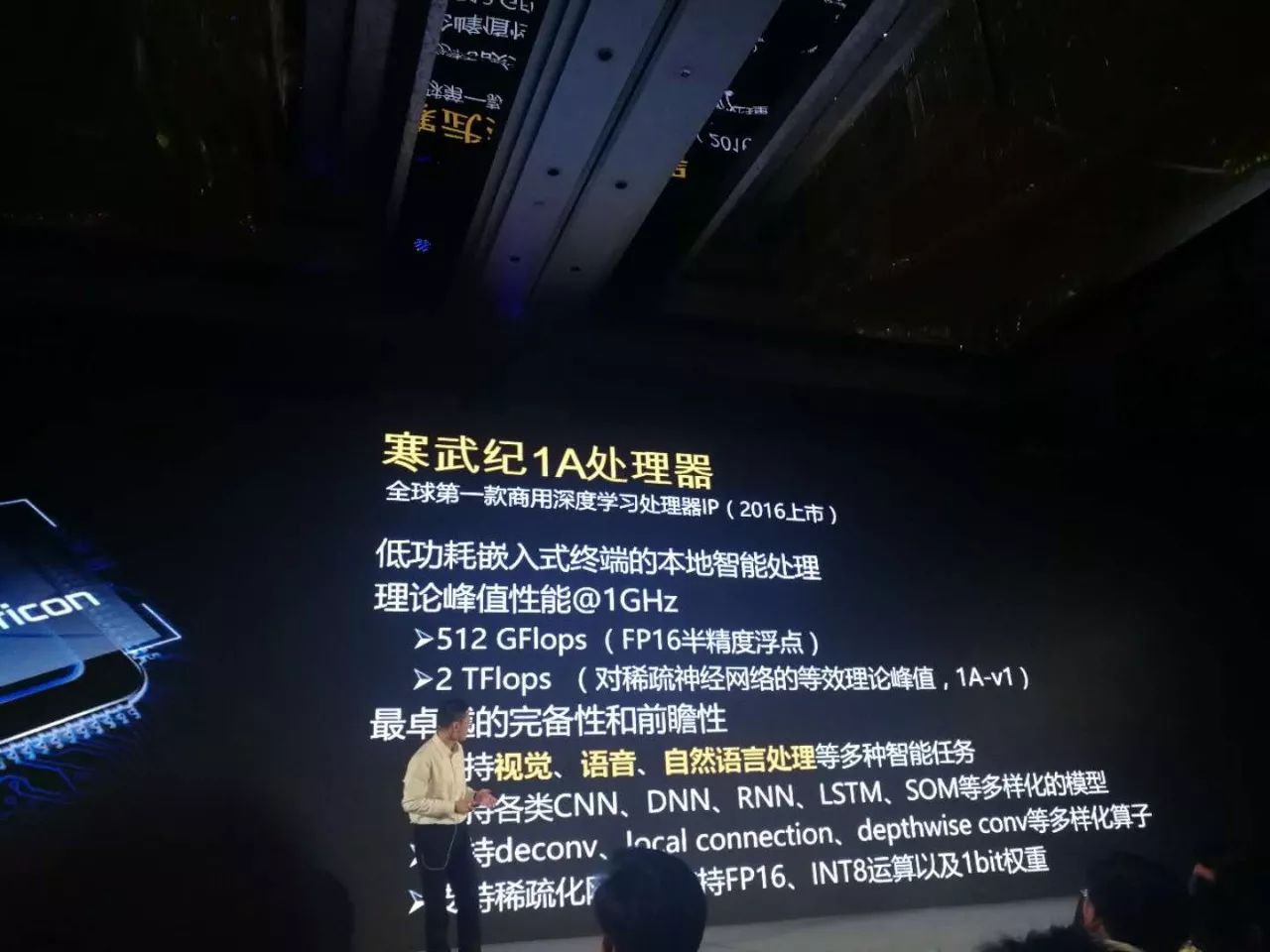 再转向国内,作为全球唯一一家芯片独角兽,诞生于中国科学院计算技术研究所,成立于 2016 年的寒武纪,早在去年就推出了一款名为「1A处理器」的商用深度学习专用处理器(NPU)(神经网络处理器)。