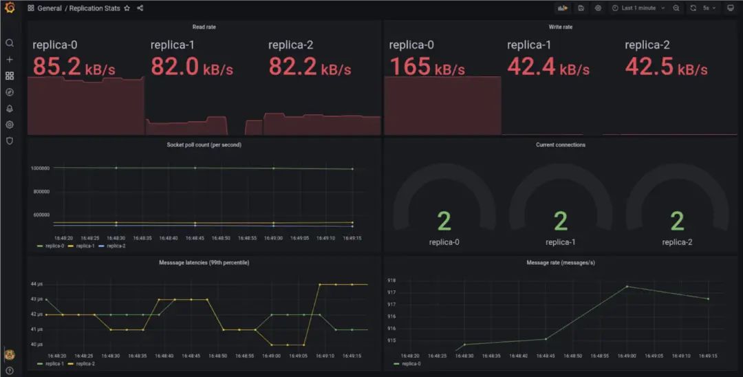 图 1 显示了指标仪表板。你可以看到在这个快照中,replica-0 是领导者,其他副本是跟随者。由于其他复制体的回执,复制体 -0 的读取率非常高。