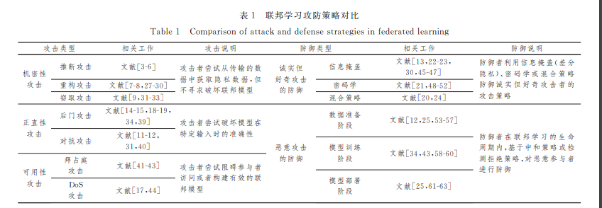 综上所述,联邦学习在建模的过程中面临着巨大的数据 安全与模型攻击挑战.文献[64]只对攻防的基础方法进行介 绍,未对联邦学习中的攻防工作进行细致讨 论.而 在 Chen 等[65]的讨论中,未对针对模型可用性的攻击策略(如拜占庭 攻击)进行综述.本文从机密性、正直性和可用性3种攻击性 质出发,重点介绍了联邦学习在建模过程中可能出现的攻击 行为,同时从诚实但好奇和恶意两个角度归纳了不同防御策 略的优点与缺点,攻防策略的对比如表1所列,最后对联邦学 习中攻防场景的发展方向和可能的应用进行了探索与展望.
