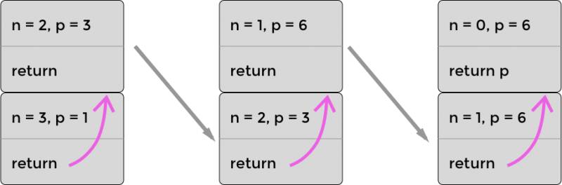 这里发生了什么?我们得到一个堆栈溢出错误!这不是无穷的递归导致的。我们已经处理了基础条件(n === 0 的情况)。那是因为浏览器的堆栈大小是有限的,而我们的代码使用了越过了这个大小的堆栈。每次对 recursiveFactorial 的调用导致了新的帧被压入堆栈中,就像一个盒子压在另一个盒子上。每当 recursiveFactorial 被调用,一个新的盒子被放在最上面。下图展示了在计算 recursiveFactorial(3) 时堆栈的样子。注意在真实的堆栈中,堆栈顶部的帧将存储在执行完成后应该返回的内存地址,但是我选择用变量 r 来表示返回值,因为 JavaScript 开发者一般不需要考虑内存地址。