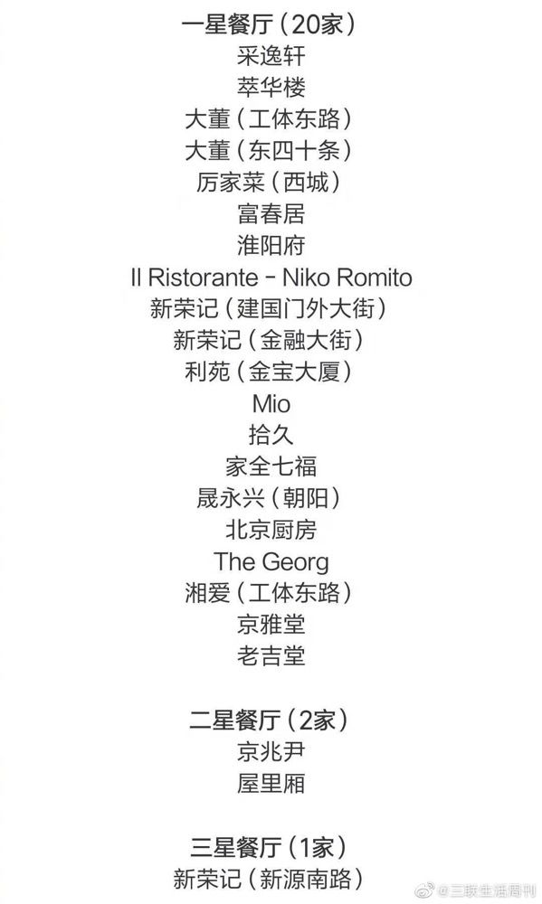 本次北京星级餐厅包含一家米其林三星餐厅,两家米其林二星餐厅,以及二十家米其林一星餐厅。