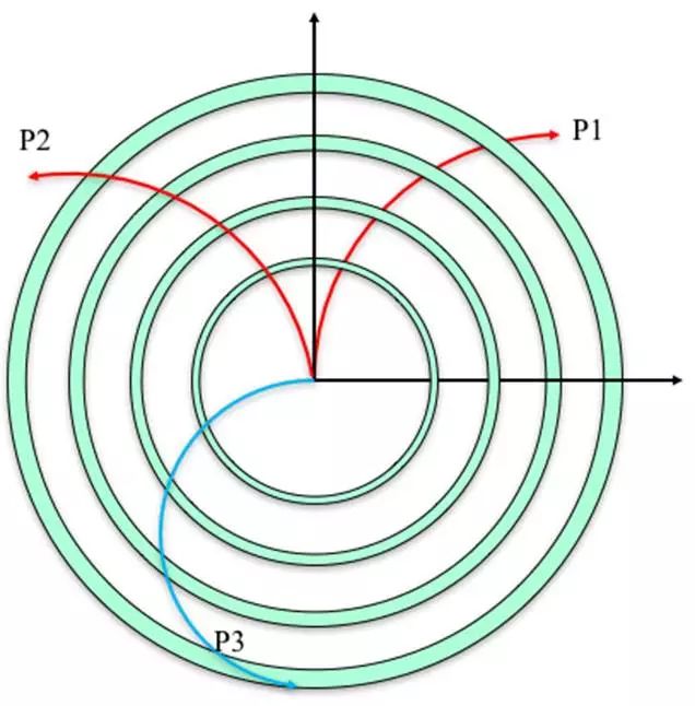 ►图6: 在轴对称探测器中,带电粒子受到磁场作用发生偏转的情形