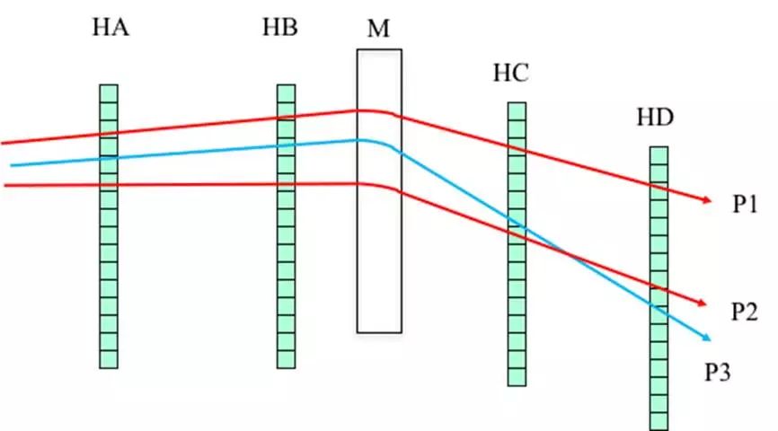比如对于如图5 的探测器,加速器生成的粒子束与固定靶碰撞。碰撞后生成一些新物质,这些新物质很快衰变,在衰变产物的飞行路径上,电磁铁M产生一个磁场。带电粒子飞过磁场区域时,运动的轨道发生偏转。动量比较大的带电粒子(如P1、P2)偏转得比较小,而动量比较小的带电粒子(如P3)偏转得比较大。