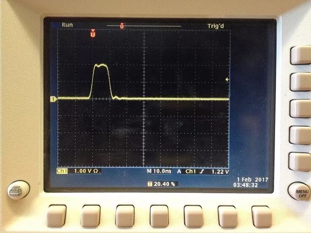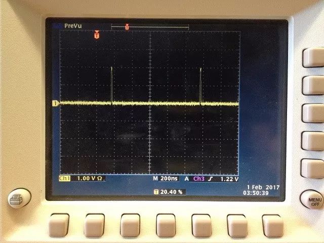 读者可能会觉得,如果我们把示波器的时间轴调成满度1微秒以上,不就能至少抓住一个脉冲吗?道理上确实没错,不过这时波形如图3 所示,在图中,满度宽度为1.6微秒,脉冲相对而言非常窄,看不清楚细节。
