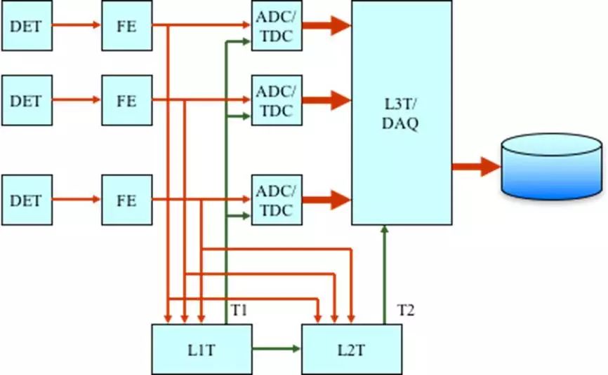 探测器(DET)所生成的电信号经过前级电子电路(FE)首先送到第一级触发系统(L1T)中,利用快速逻辑电子电路做粗略的判断。第一级触发系统判断可能存在有用的物理事件后,发出一个触发信号(T1),启动数字化(ADC/TDC)系统。早期的数字化器件,一旦被启动便无法继续监测输入信号。因此如果数字化进程启动得过于频繁,就会带来很大比例的系统死时间。因而,必须首先判断出在探测器里存在比较靠谱的信号组合时才能启动数字化,“不见兔子不撒鹰”。