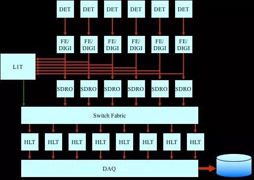 具体的做法是每一个SDRO将同一事例的数据打包,贴上同一台HLT的IP地址,然后送入交换机。交换机根据数据的IP地址,送到相应的HLT计算机。可以想象,对于源源不断地到来的不同事例,SDRO必须贴上不同的IP地址,以便让HLT计算机阵列中的每一台计算机都能平均地分担到合理的数据处理工作量。每个事例的数据经过HTL运行的触发软件判选,如果事例中的数据符合预定的触发条件,则整个事例的所有数据就会被送入数据获取计算机(DAQ)最终存入磁盘或其它大规模存储设备。