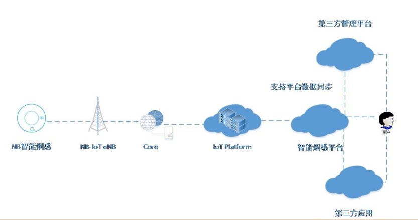 具体原理是:烟感设备通过 NB 网络接入运营核心网,运营核心网将数据传给运营商IoT平台,运营商IoT平台将数据传给业务平台,业务平台进行业务处理。