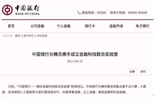 北京时间2017年6月22日,中国银行正式公布与腾讯全面合作成立“中国银行——腾讯金融科技联合实验室”。