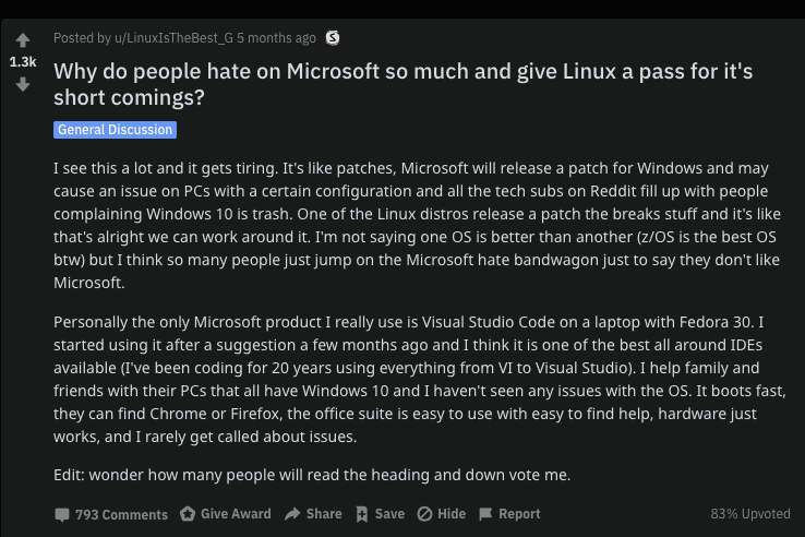 Reddit 上一篇《Why do people hate on Microsoft so much and give Linux a pass for it's short comings?》的帖子,超过 1300 人点赞;在 Slashdot 上,《Why Does Everyone Hate Microsoft?》下有超过 1500 回复表达对微软的痛恨。