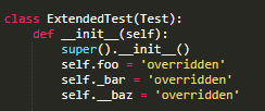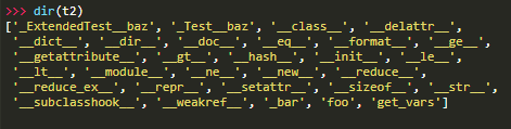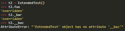 现在,你认为foo,_bar和__baz的值会出现在这个ExtendedTest类的实例上吗? 我们来看一看: