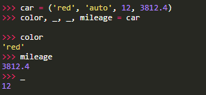 在下面的代码示例中,我将汽车元组拆分为单独的变量,但我只对颜色和里程值感兴趣。 但是,为了使拆分表达式成功运行,我需要将包含在元组中的所有值分配给变量。 在这种情况下,“_”作为占位符变量可以派上用场: