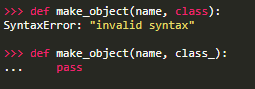 有时候,一个变量的最合适的名称已经被一个关键字所占用。 因此,像class或def这样的名称不能用作Python中的变量名称。 在这种情况下,你可以附加一个下划线来解决命名冲突: