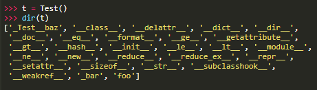 如果你仔细观察,你会看到此对象上有一个名为_Test__baz的属性。 这就是Python解释器所做的名称修饰。 它这样做是为了防止变量在子类中被重写。