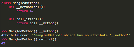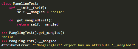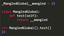 在这个例子中,我声明了一个名为_MangledGlobal__mangled的全局变量。然后我在名为MangledGlobal的类的上下文中访问变量。由于名称修饰,我能够在类的test()方法内,以__mangled来引用_MangledGlobal__mangled全局变量。