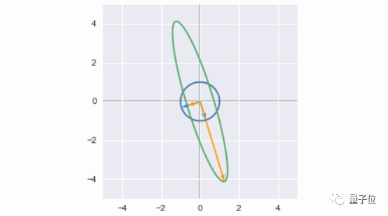 △ 特征向量 (蓝箭头) ,线性变换后的向量 (黄箭头)