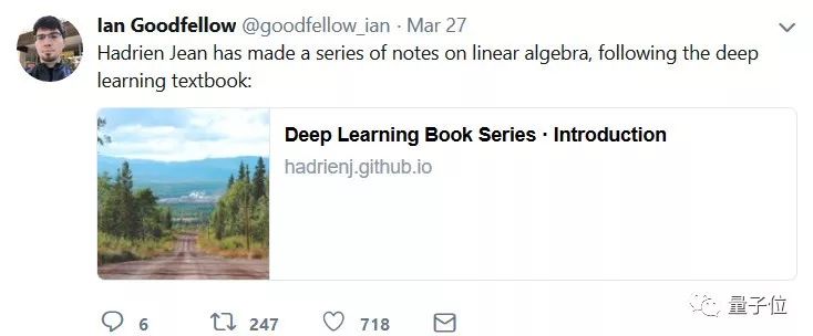 最近,巴黎高等师范学院的博士生Hadrien Jean,整理了关于深度学习“花书”的一套笔记,还有幸在推特上被Ian Goodfellow老师翻了牌。
