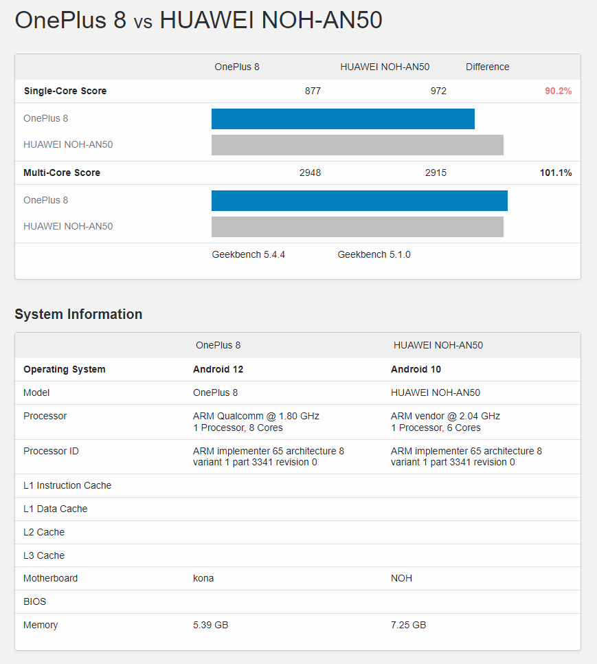 而近日,搭载麒麟 9000L 的华为手机 NOH-AN50 的跑分在 Geekbench 网站上曝光,疑似为 Mate 40E Pro 5G。其中单核跑分为 899-968 分,多核跑分为 2541-2902 分。作为对比,天玑 1200 单核分数为 828-974 分,多核分数最高 2732-3350 分。