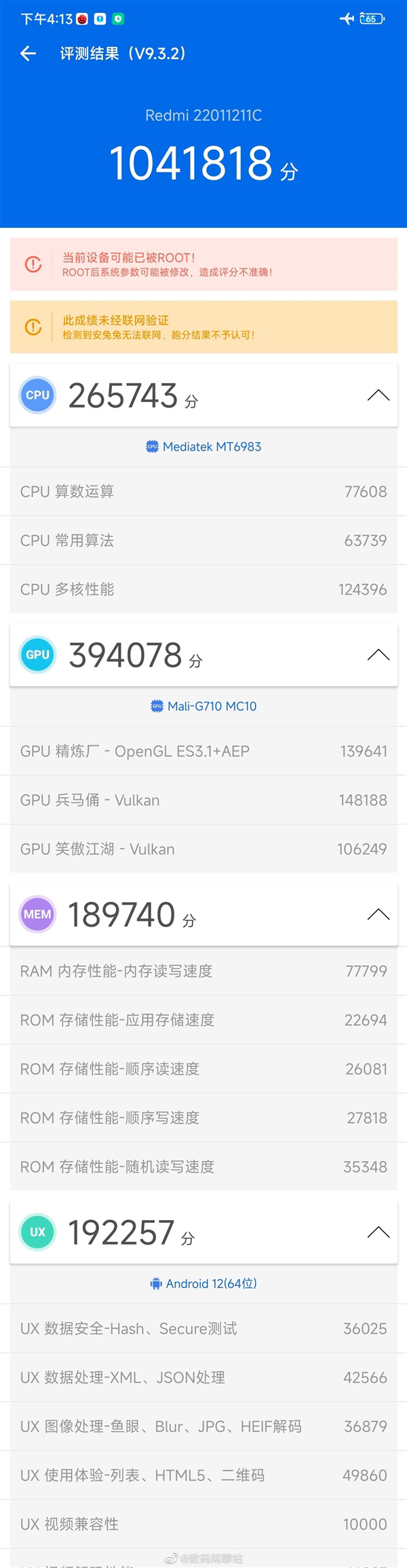 根据@数码闲聊站曝光的跑分截图,Redmi K50 Pro+ 搭载了天玑 9000 处理器,综合成绩达 1041818 分,CPU 部分测试成绩 265743 分,GPU 部分测试成绩 394078 分,MEM 部分测试成绩 189740 分,UX 部分测试成绩 192257 分。