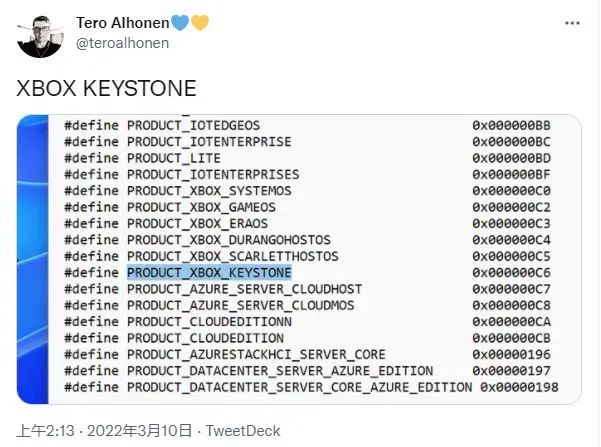据 Gamerant 报道,业内人士 Tero Alhonen 发现了一个代号为 Xbox Keystone 的新项目。Xbox 喜欢给新项目起一个代号,在 2019 年的 E3 展会上,Xbox 宣布了代号 Scarlett,也就是后来推出的 Xbox Series X 主机。