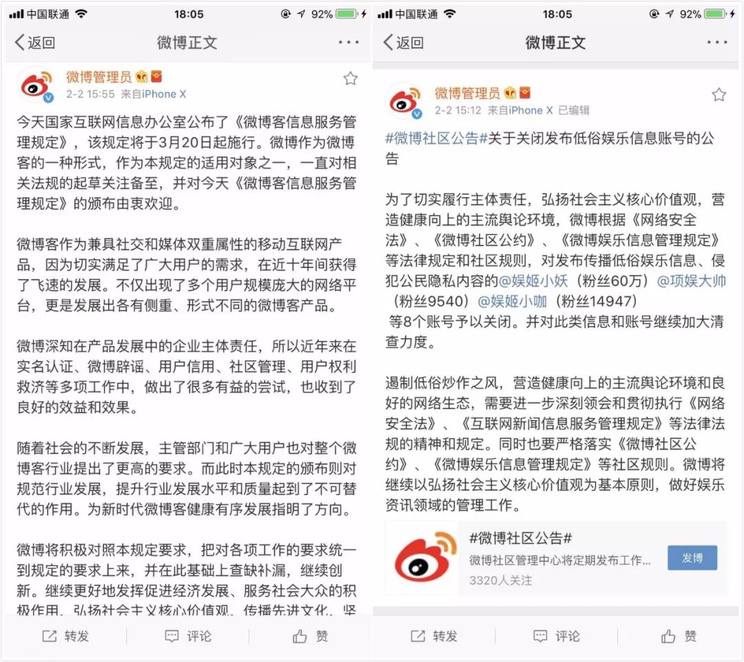 2月1日,微博发布“11~12月违规涨粉账号处理公告”和“关于新星榜数据异常的公告”。