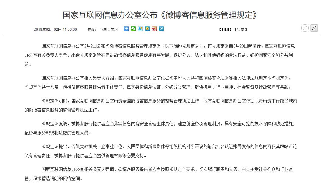 1月27日,北京网信办针对新浪微博对用户发布违法违规信息未尽到审查义务,持续传播炒作导向错误、低俗色情、民族歧视等违法违规有害信息的严重问题约谈该企业负责人,责令其立即自查自纠,全面深入整改。