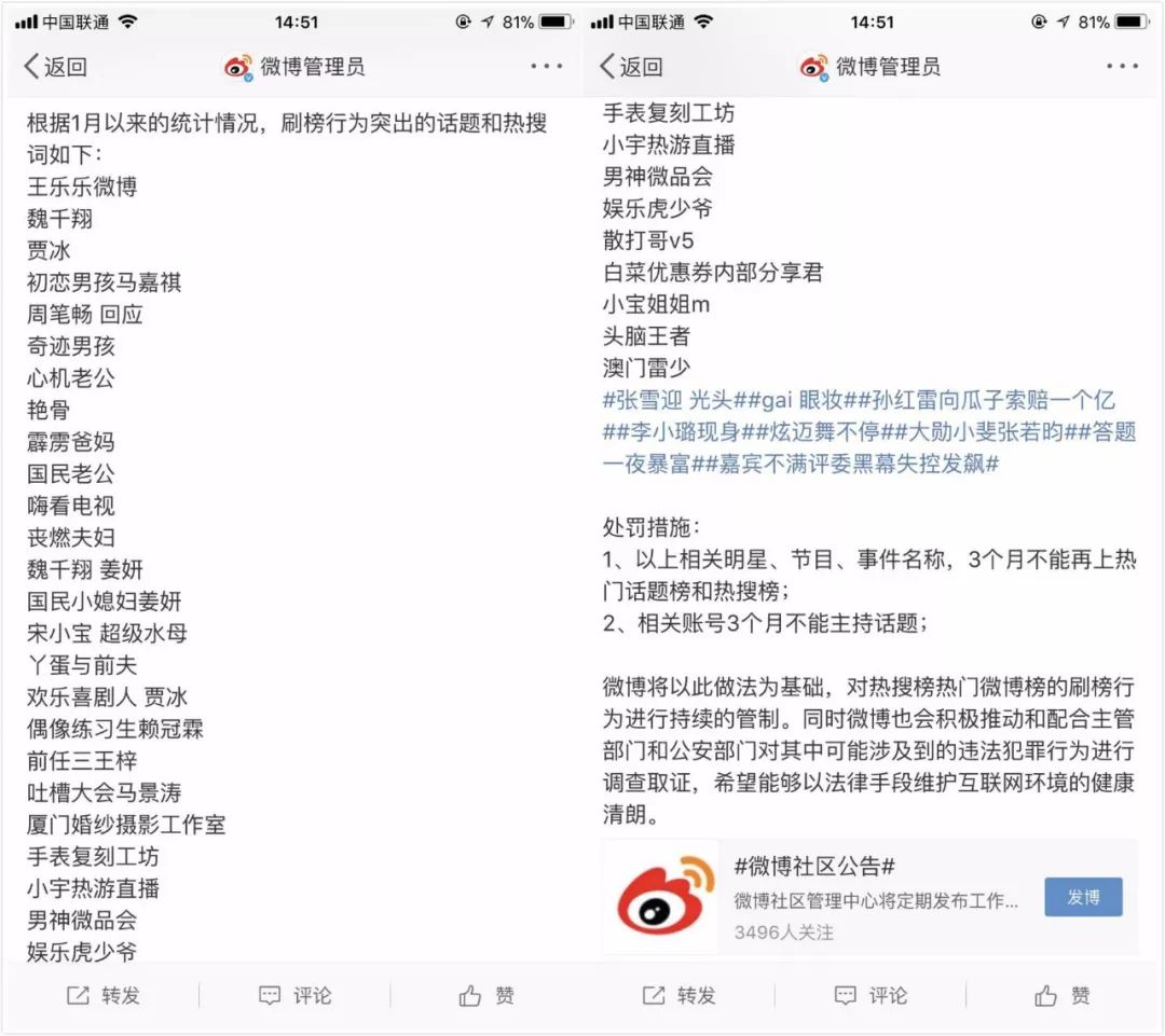 对此,微博官方表示以上相关明星、节目、事件名称,3个月不能再上热门话题榜和热搜榜;相关账号3个月不能主持话题。