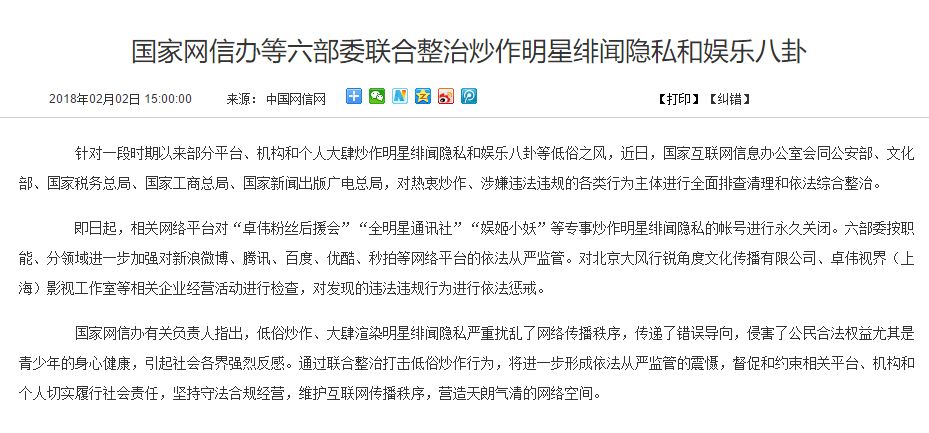 二是国家网信办等六部门联合整治炒作明星绯闻隐私和娱乐八卦。