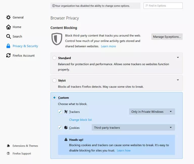 Mozilla试图通过仅阻止已知的跟踪器而不是所有cookie,一位发言人表示,该公司发现阻止所有cookie导致一些网站可能无法正常运行。任何想要更多保护的用户都可以进入Firefox的设置并进行更改跟踪阻止设置从默认的“标准”选项 到“严格”选项。