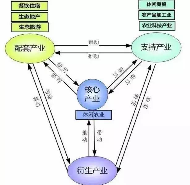 农业休闲综合体的综合产业链包括核心产业、支持产业、配套产业、衍生产业四个层次的产业群。