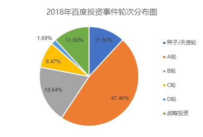 从百度在 2018 年的投资轮次来看,百度在 2018 年还是以早期投资为主,早期投资(种子/天使轮、A 轮)占比接近六成(约为 59.32%),中期投资(B、C 轮)占比 27.12%,后期投资(D 轮及以后)占比 13.56%。