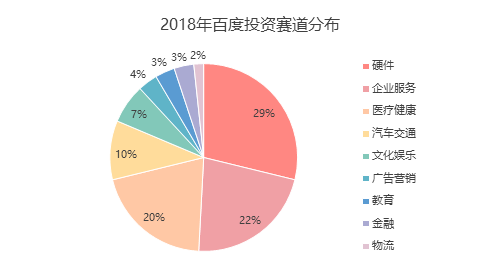 从行业分布来看,硬件、企业服务和医疗健康是百度重点布局的赛道,三大赛道投资事件占比超过七成。