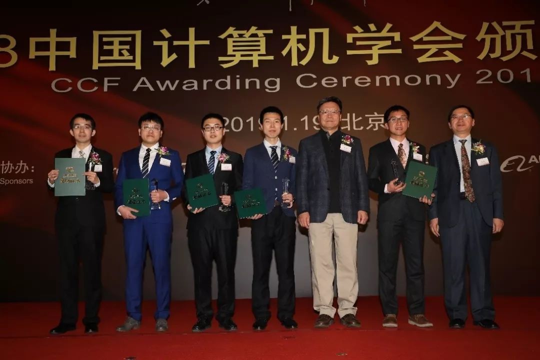 微软亚洲研究院副院长周明(右一)为2018 CCF优博奖获得者颁奖