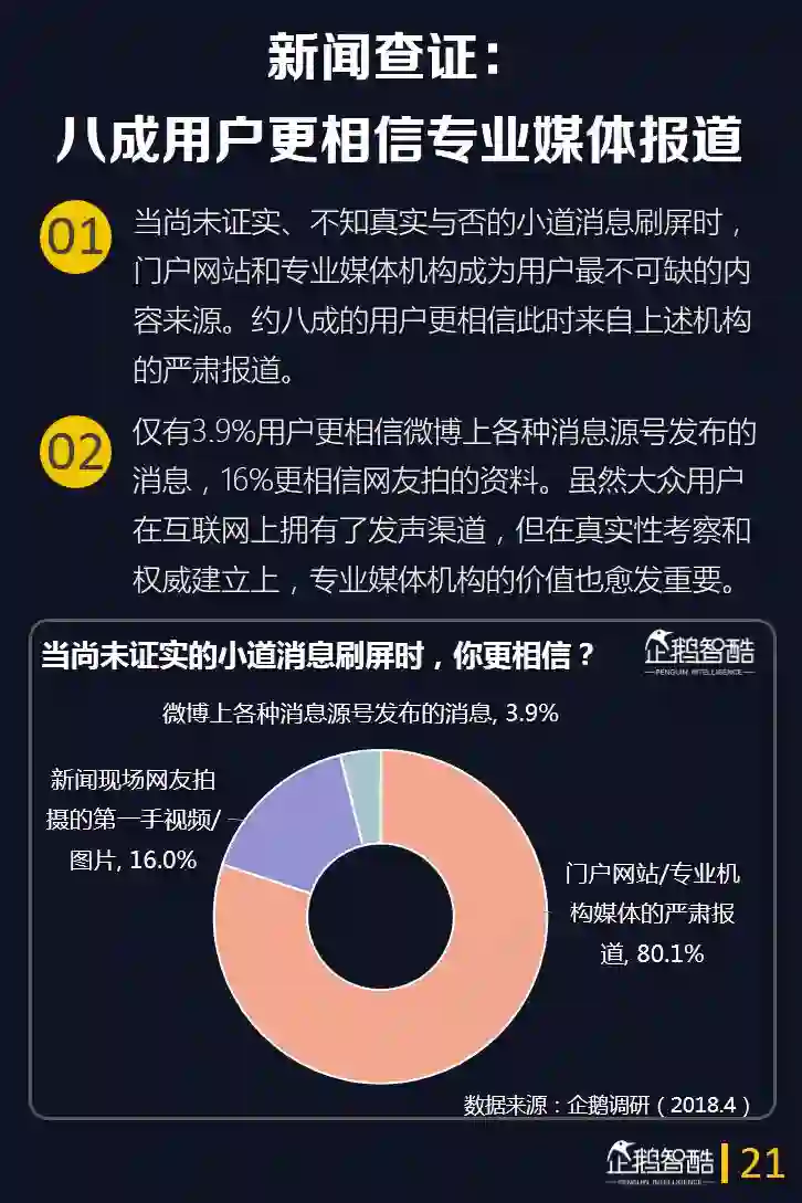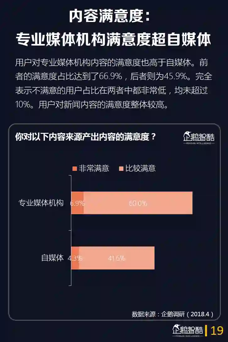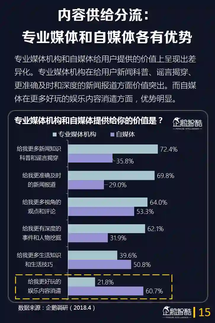 6.从内容供给看,专业媒体机构和自媒体给用户提供的价值上呈现出明显的差异化。专业媒体机构在给用户更多的新闻科普、谣言揭穿、更准确及时和深度的新闻报道方面价值突出。而自媒体在更多好玩的娱乐内容消遣方面,优势明显。