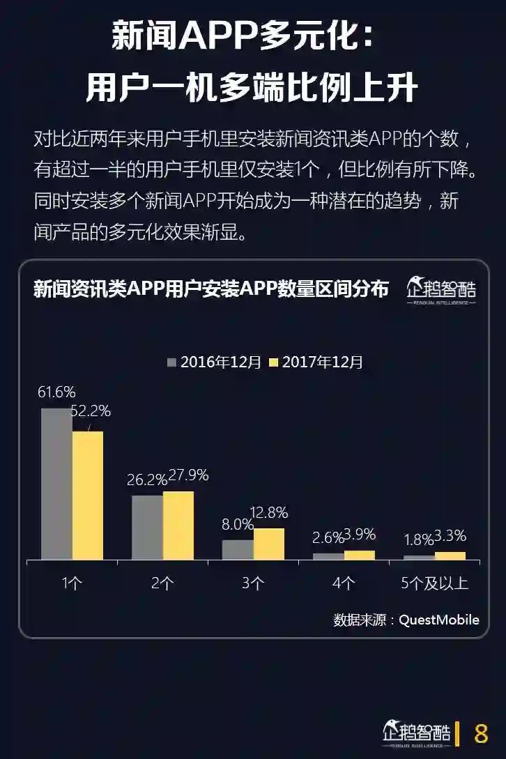 3.用户手机里安装的新闻资讯APP个数也呈现上升趋势。虽然有超过一半用户手机里仅安装1个新闻资讯APP,但比例从61.6%下降到52.2%。
