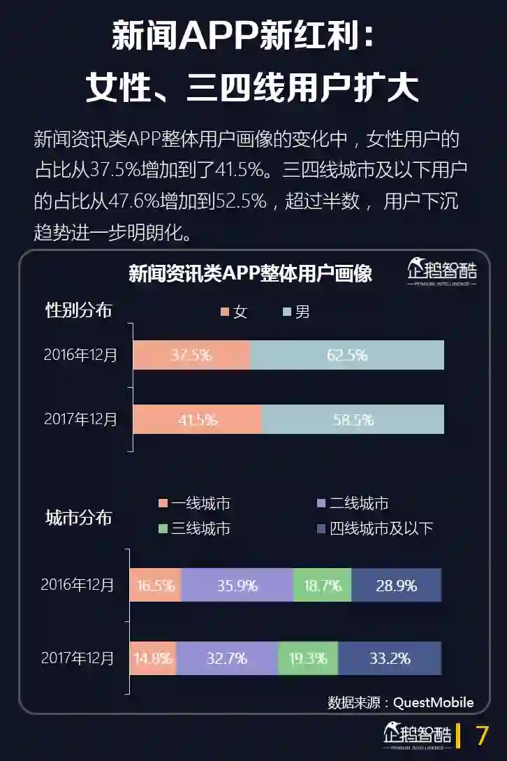 2.新闻资讯类APP的用户中,女性和三四线用户的占比扩大。女性用户的占比从37.5%增加到了41.5%,三四线城市及以下用户的占比从47.6%增加到52.5%。