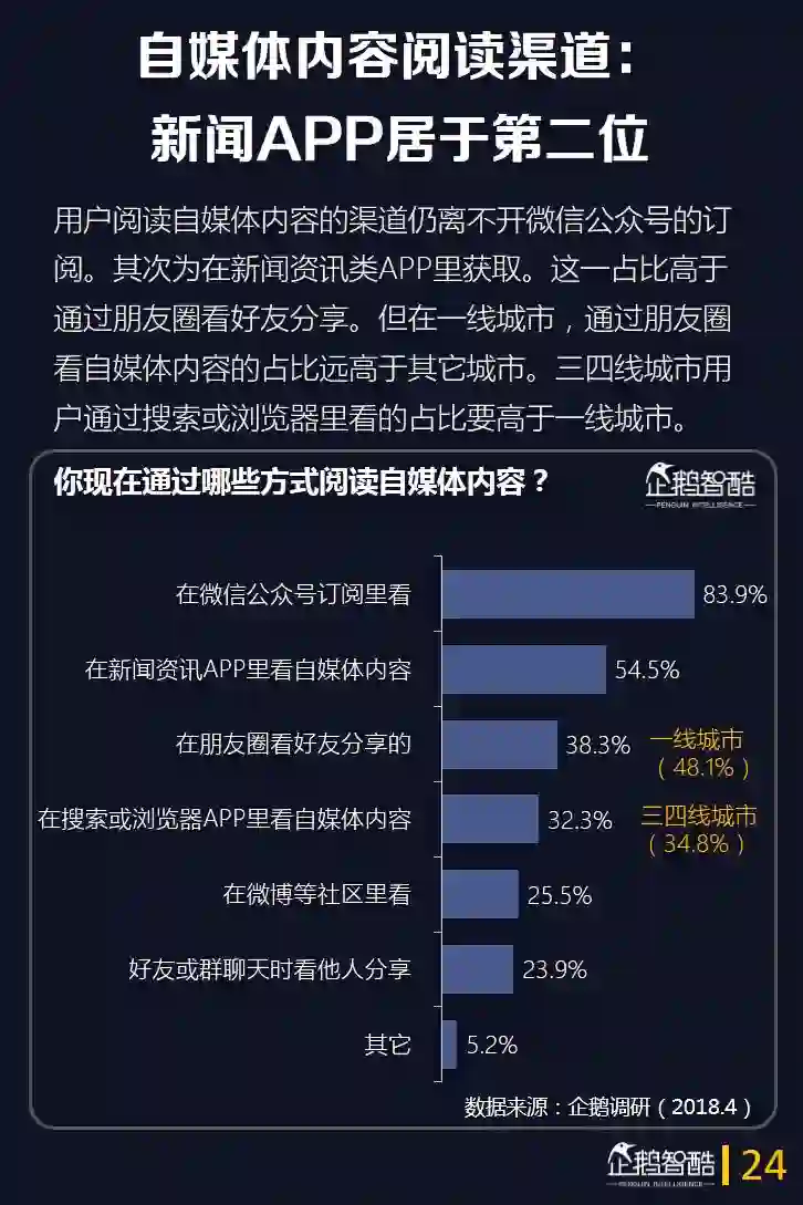 7.自媒体内容的阅读渠道仍主要集中在微信公众号的订阅。其次为新闻资讯类APP,这一占比高于通过朋友圈看好友分享。但在一线城市,通过朋友圈看自媒体内容的占比远高于其它城市。