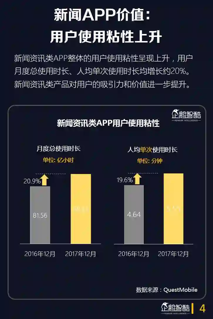 1.新闻资讯类APP整体的用户使用粘性呈现上升,用户的月度总使用时长、人均单次使用时长均增长了约20%。新闻资讯类产品对用户的吸引力和价值进一步提升。