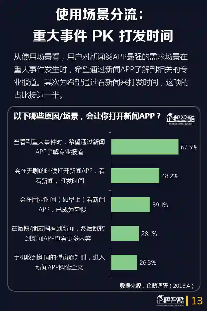 4.从使用场景看,用户对新闻类APP最强的需求场景在重大事件发生时,67.5%的用户希望此时通过新闻APP了解到相关的专业报道。其次为希望通过看新闻来打发时间,这项的占比接近一半。