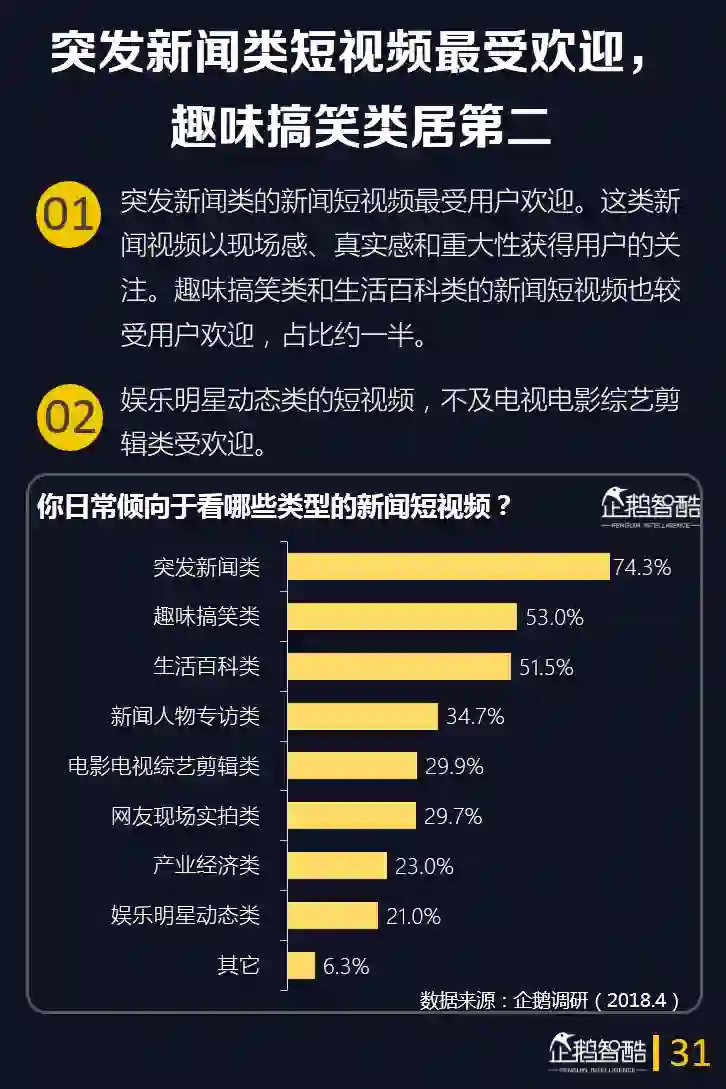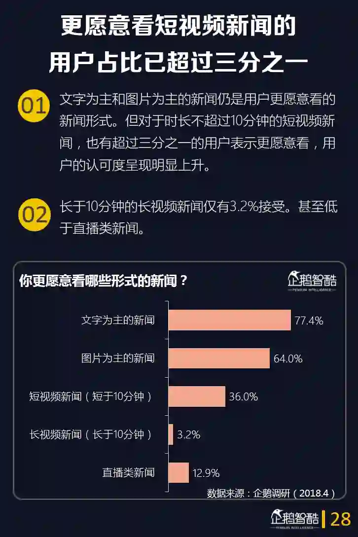 9.新闻资讯类短视频崛起明显。有超过三分之一的用户表示更愿意看短视频形式的新闻资讯。