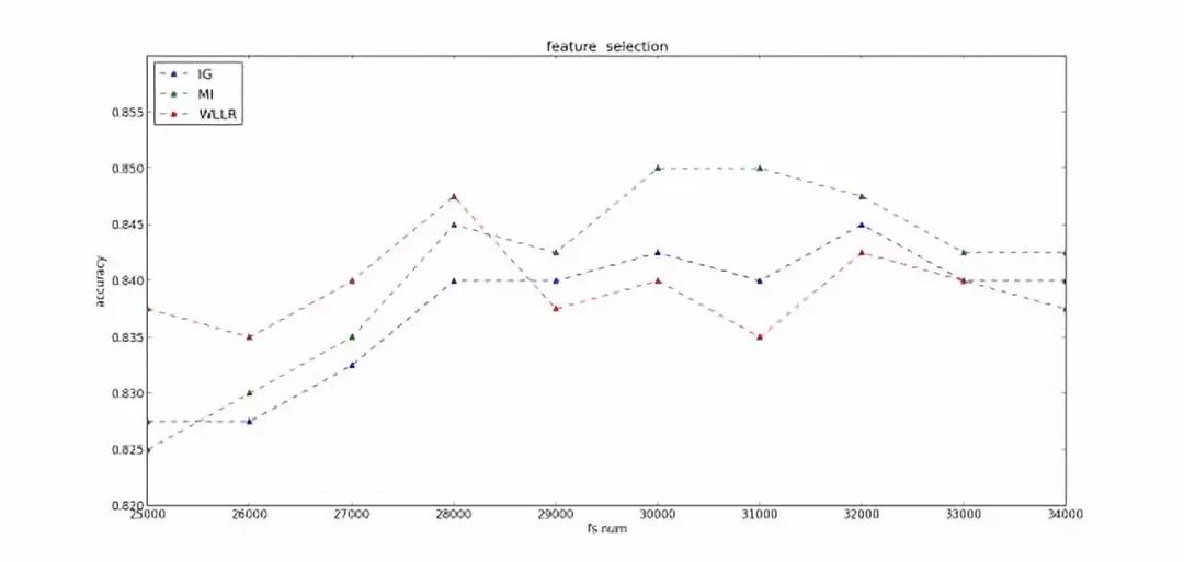 从上面的图看出:分类的性能随着特征选择的数量的增加,呈现“凸”形趋势:1)在特征数量较少的情况下,不断增加特征的数量,有利于提高分类器的性能,呈现“上升”趋势;2)随着特征数量的不断增加,将会引入一些不重要的特征,甚至是噪声,因此,分类器的性能将会呈现“下降”的趋势。这张“凸”形趋势体现出了特征选择的重要性:选择出重要的特征,并降低噪声,提高算法的泛化能力。