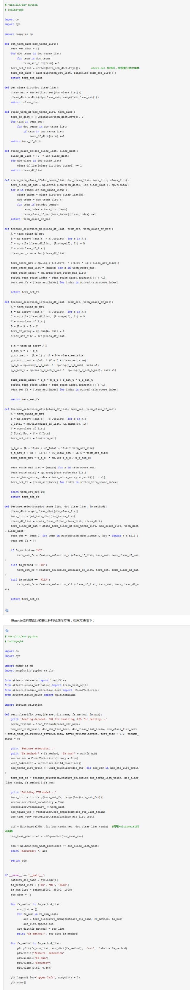笔者实现了三种特征选择方法:IG,MI和WLLR,看官如果对其他特征选择方法感兴趣,可以尝试实现一下~ 好了,啥也不说了,上代码,特征选择模块代码: